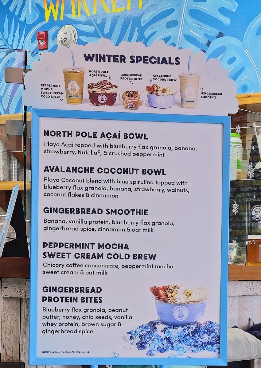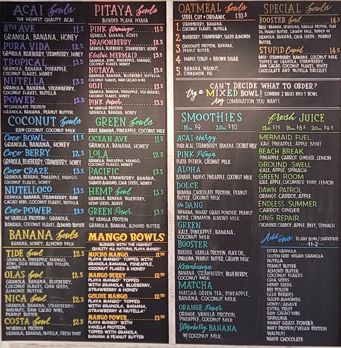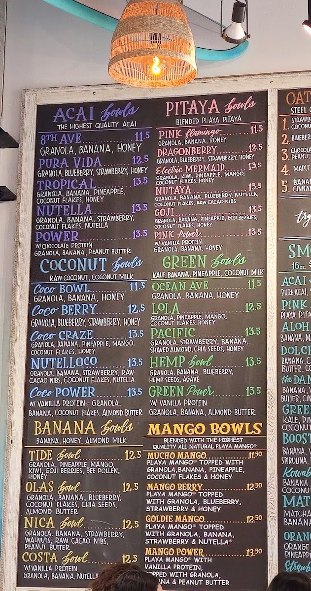 Playa passion fruit base topped with blueberry flax granola, strawberry, pineapple, coco whip & honey