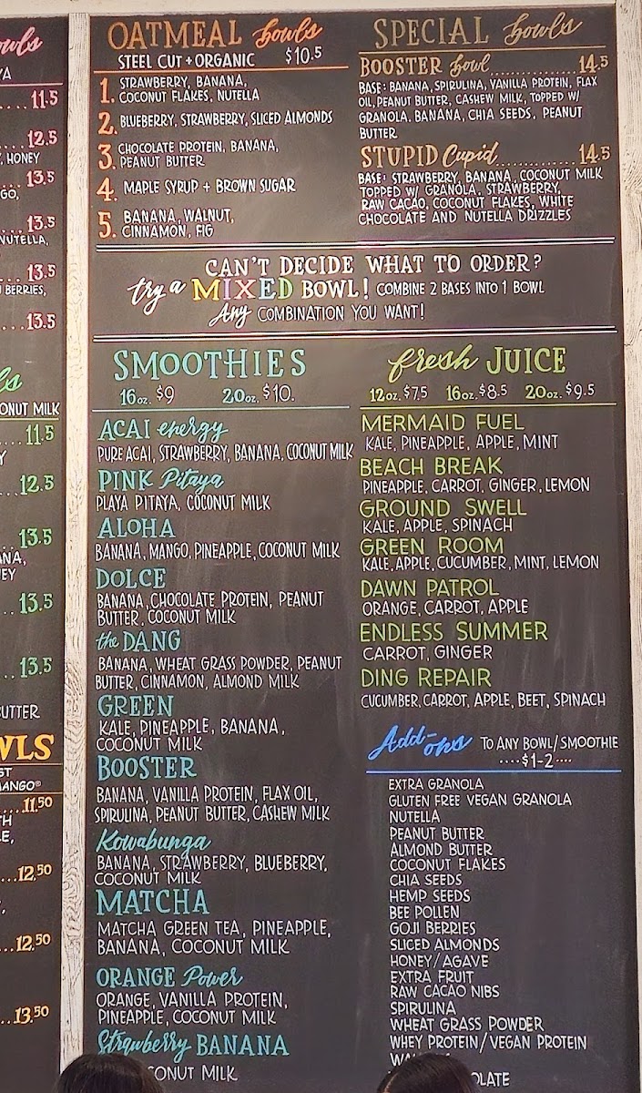 Booster Base: Banana, spirulina, peanut butter, vanilla protein, flax oil, cashew milk. Topped with Granola, banana, peanut butter, and chia seeds.
